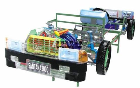 本品選用透明有機(jī)玻璃制作,內(nèi)中部件均以硬質(zhì)塑料料加工,用 螺絲固定在金屬高溫烘漆而成的車(chē)架上。各總成部分都以壓模成形加 工,代替過(guò)去膠粘合的方法,使產(chǎn)品在強(qiáng)度上有很大提高。發(fā)動(dòng)機(jī)總成用電機(jī)驅(qū)動(dòng),在油門(mén)處設(shè)有調(diào)速裝置,能演示發(fā)動(dòng)機(jī)轉(zhuǎn)速高低。離合器分離明顯,操縱靈活,離合器外殼整體壓模而成,變速箱和各檔齒輪用各種顏色表示,換檔靈活,手制動(dòng)美觀(guān)。后橋外形壓模而成,內(nèi)中主減速、差速轉(zhuǎn)動(dòng)自如,輪轂剎蹄壓模成型,剎蹄可調(diào)節(jié),前橋輪鼓可調(diào)整,轉(zhuǎn)向裝置以及電瓶、油箱、水箱,制動(dòng)管路分布清楚一目了然。電路采用對(duì)插件前后分布,燈架、風(fēng)窗、儀表板、后燈架用透明有機(jī)玻璃壓模成整體美觀(guān)逼真。