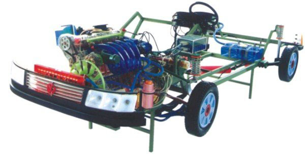 本品選用透明有機(jī)玻璃制作,內(nèi)中部件均以硬質(zhì)塑料料加工,用 螺絲固定在金屬高溫烘漆而成的車(chē)架上。各總成部分都以壓模成形加 工,代替過(guò)去膠粘合的方法,使產(chǎn)品在強(qiáng)度上有很大提高。發(fā)動(dòng)機(jī)總成用電機(jī)驅(qū)動(dòng),在油門(mén)處設(shè)有調(diào)速裝置,能演示發(fā)動(dòng)機(jī)轉(zhuǎn)速高低。離合器分離明顯,操縱靈活,離合器外殼整體壓模而成,變速箱和各檔齒輪用各種顏色表示,換檔靈活,手制動(dòng)美觀(guān)。后橋外形壓模而成,內(nèi)中主減速、差速轉(zhuǎn)動(dòng)自如,輪轂剎蹄壓模成型,剎蹄可調(diào)節(jié),前橋輪鼓可調(diào)整,轉(zhuǎn)向裝置以及電瓶、油箱、水箱,制動(dòng)管路分布清楚一目了然。電路采用對(duì)插件前后分布,燈架、風(fēng)窗、儀表板、后燈架用透明有機(jī)玻璃壓模成整體美觀(guān)逼真。
